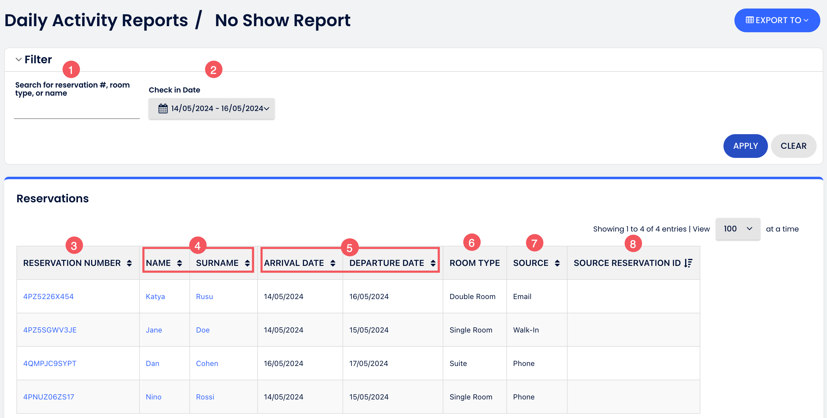 - ค้นหาหมายเลขการจอง, ประเภทห้อง, หรือชื่อ: ดูการจองเฉพาะโดยการป้อนหมายเลขการจอง, ประเภทห้อง, หรือชื่อแขก ปล่อยช่องว่างเพื่อดูรายการทั้งหมดของแขกของคุณ
