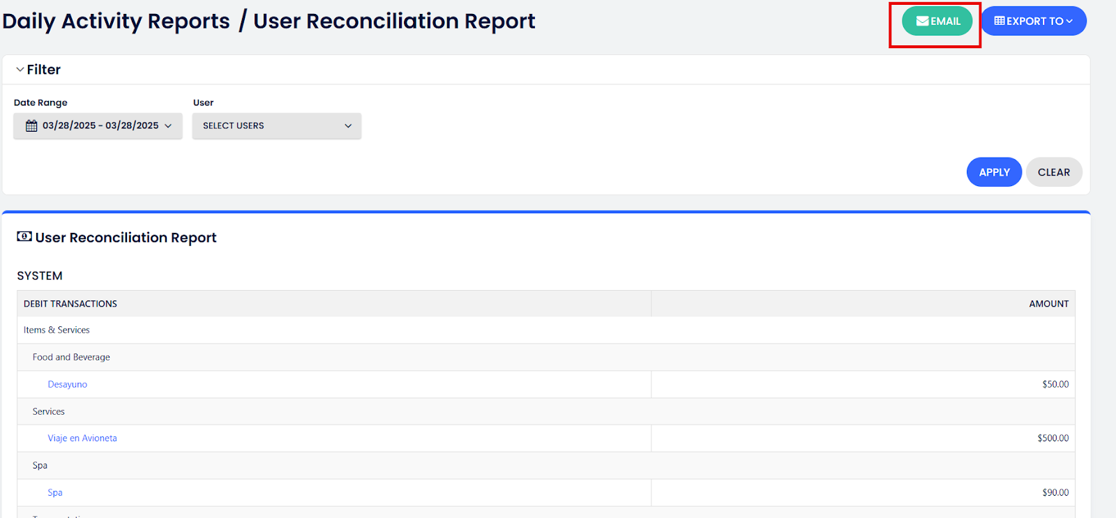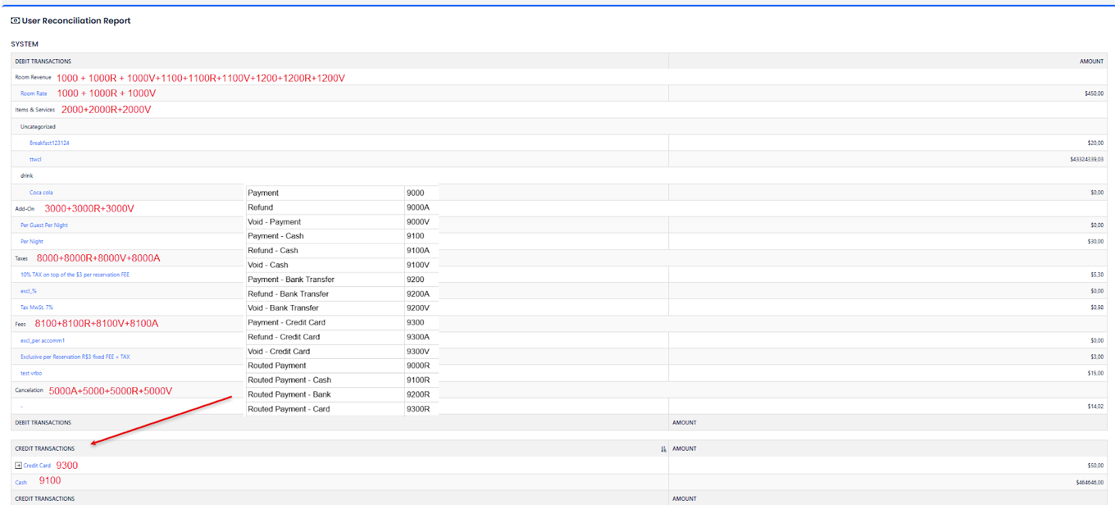 รายงาน การกระทบยอดของผู้ใช้ รายละเอียด ธุรกรรมทางการเงินของผู้ใช้ ที่เชื่อมโยงกับ กิจกรรมของแขก เช่น การบริโภคในร้านอาหาร บริการเสริม และภาษี