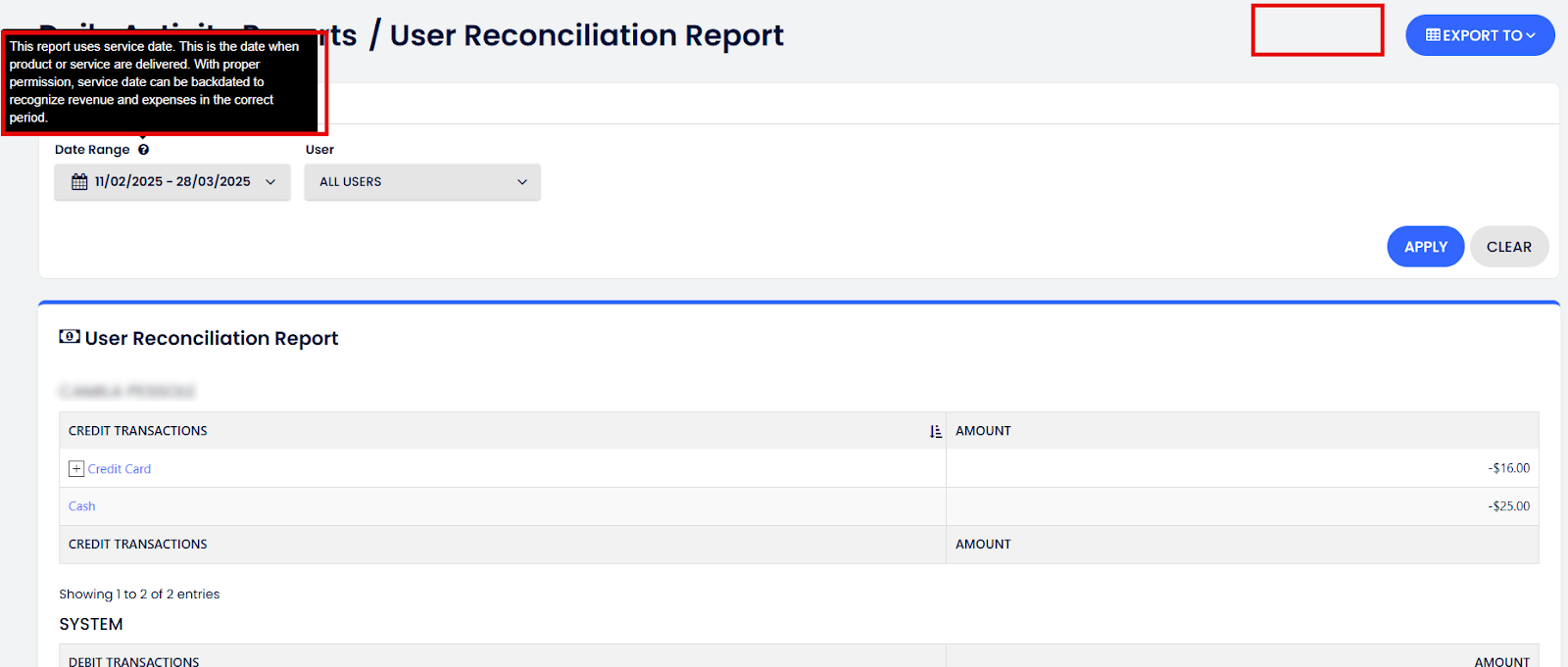 - ระบบจะแสดงข้อมูลเกี่ยวกับ ธุรกรรมเดบิต และ ธุรกรรมเครดิต ที่เกี่ยวข้องกับ ผู้ใช้ที่เฉพาะเจาะจง ในวันที่ที่เลือก