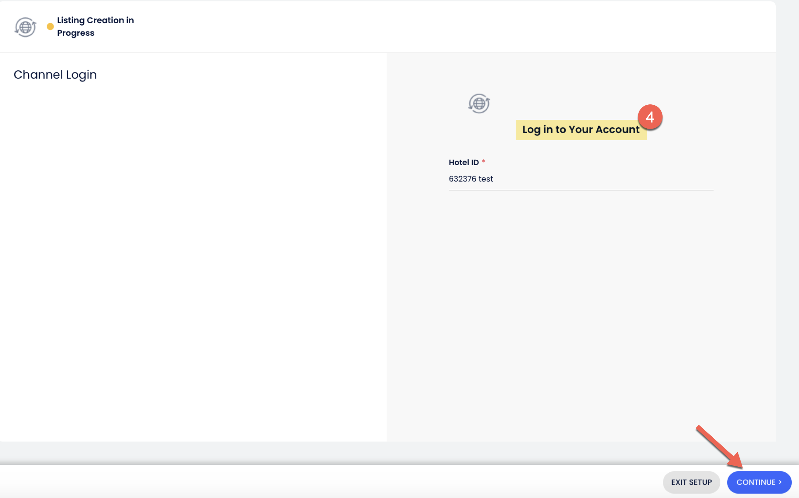 1. เข้าสู่ระบบด้วย รหัสโรงแรม ของช่องทางและคลิก ดำเนินการต่อ เพื่อดำเนินการต่อ