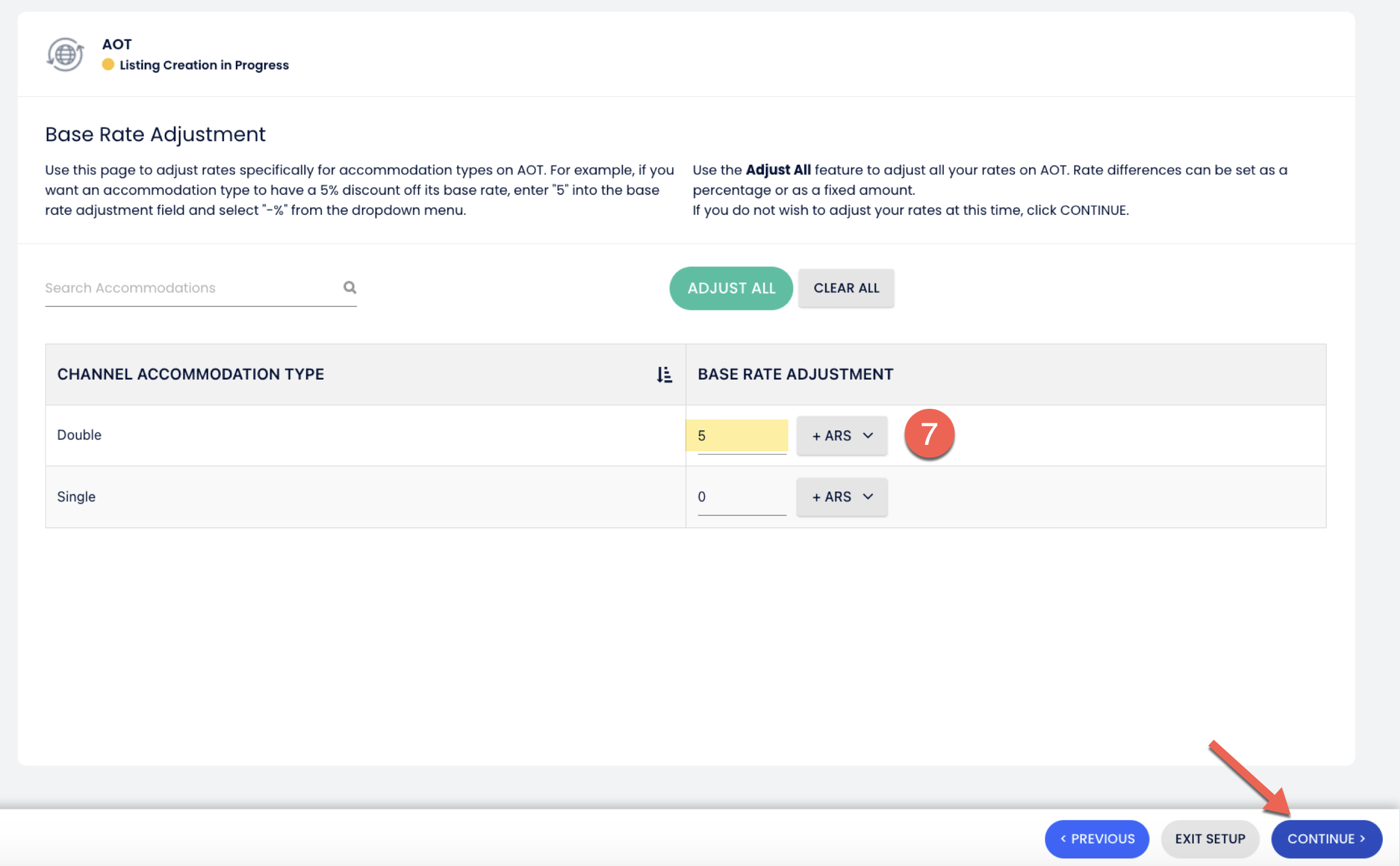 1. เพิ่ม การปรับเปลี่ยนอัตรามาตรฐาน สำหรับแต่ละประเภทห้อง (ถ้าจำเป็น) เมื่อเสร็จสิ้น คลิก ดำเนินการต่อ หรือปล่อยให้เป็นศูนย์หากคุณต้องการข้ามมัน.
