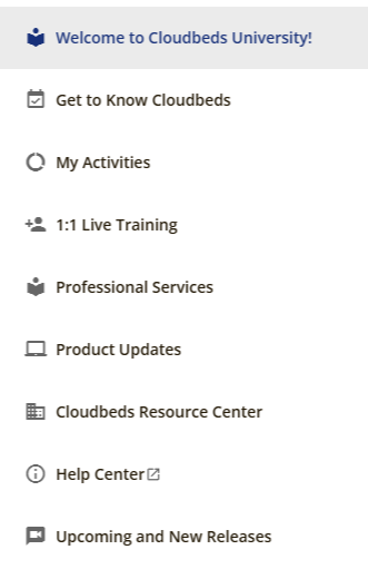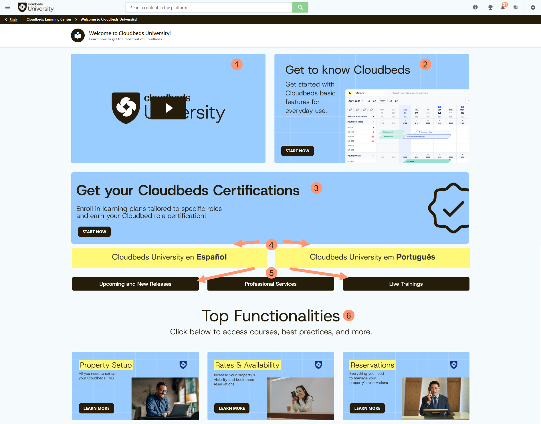 เมื่อคุณเข้าสู่ Cloudbeds University คุณจะพบกับ ส่วนหลักต่อไปนี้: