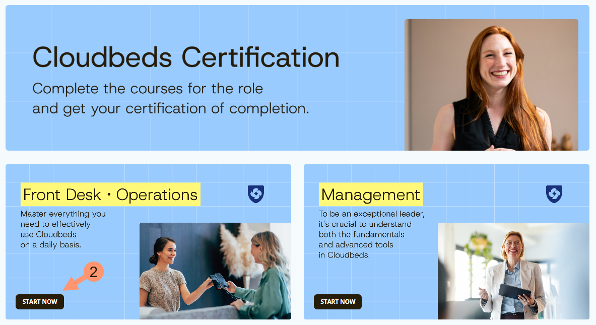 Cloudbeds University ให้ ที่ เริ่มต้น - หน้าการรับรองจะแสดงหลักสูตรเฉพาะบทบาท/แผนกต่างๆ เพื่อเริ่มหลักสูตร ให้