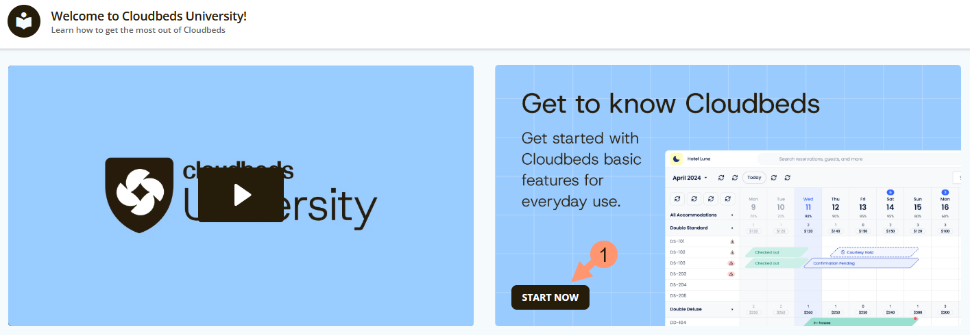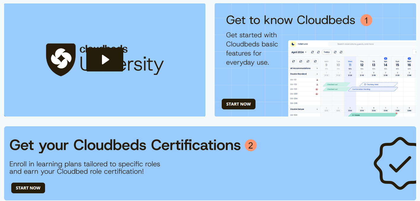 Cloudbeds University แพลตฟอร์มการเรียนรู้เฉพาะของเรา ออกแบบมาเพื่อให้ผู้ใช้สามารถค้นหา สื่อการฝึกอบรมที่มีทั้งหมด เกี่ยวกับระบบและเครื่องมือของ Cloudbeds ได้อย่างง่ายดาย โดยมีทรัพยากรครบถ้วนเพื่อเรียนรู้ซอฟต์แวร์ของเราอย่างรวดเร็ว พัฒนาประวัติการทำงาน ก้าวหน้าในอาชีพ และเพิ่มประสิทธิภาพการดำเนินงานธุรกิจการต้อนรับของคุณ