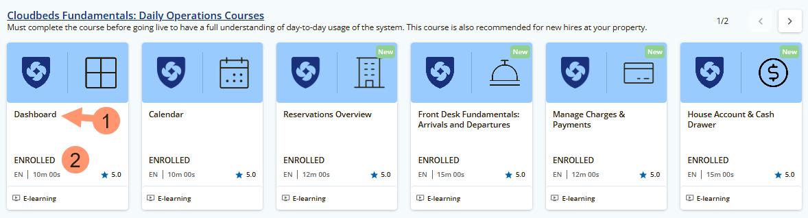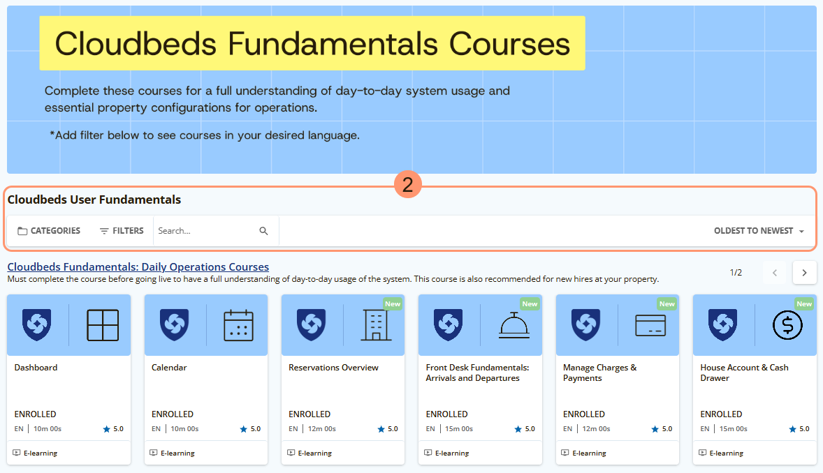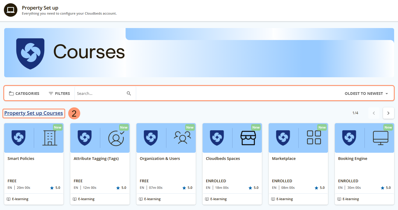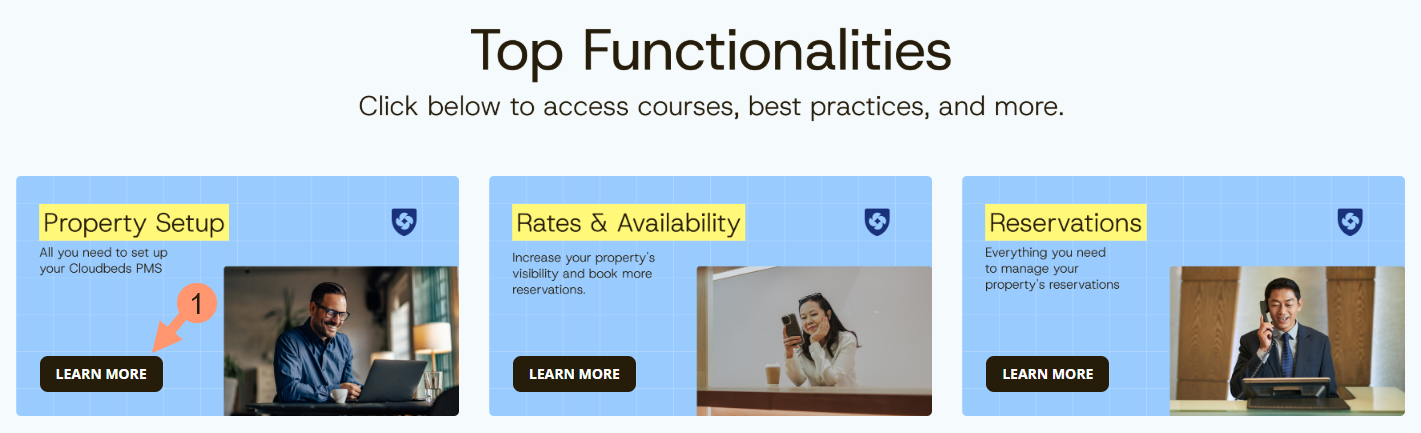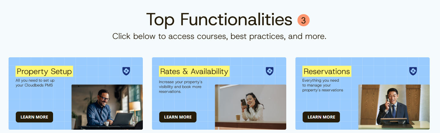 - ใต้แถบด้านบน ผู้ใช้จะพบหลักสูตรหลากหลายตามส่วนและเครื่องมือพื้นฐานของ Cloudbeds PMS คลิกที่หลักสูตรเพื่อเข้าใช้งาน