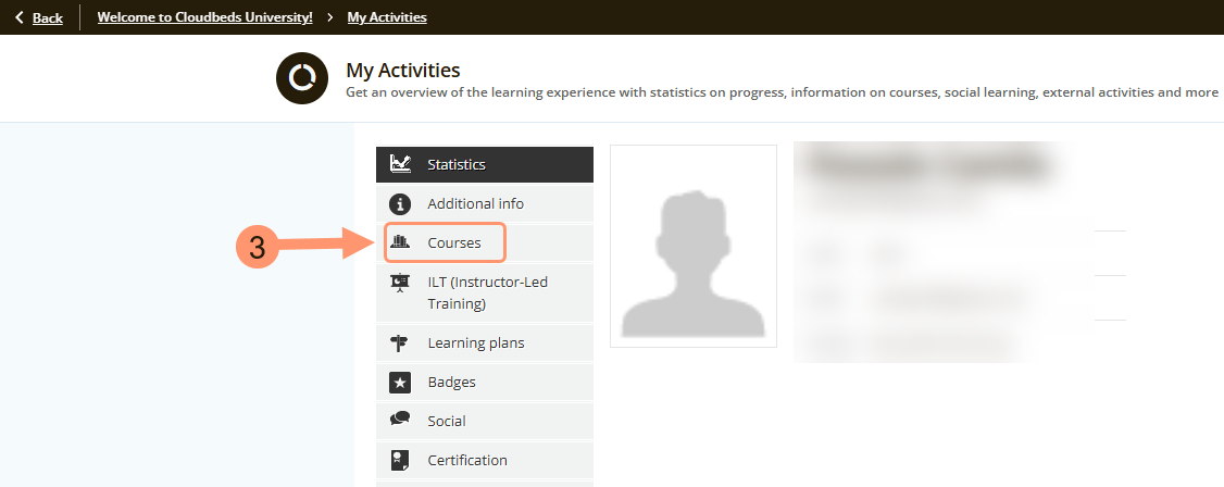 เลื่อนลงไปที่ด้านล่างของหน้า ทำความรู้จักกับ Cloudbeds เพื่อดู หลักสูตรที่กำลังเรียนอยู่ คุณสามารถเรียนต่อได้โดยการคลิกที่หลักสูตรที่ต้องการเรียนต่อได้เลย: