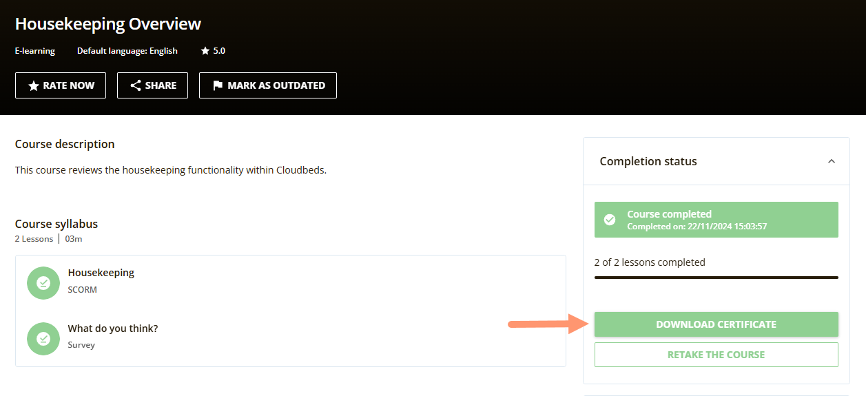 เมื่อคุณทำหลักสูตรหรือแผนการเรียนรู้ใน Cloudbeds University เสร็จสมบูรณ์แล้ว คุณสามารถดาวน์โหลด ใบรับรองการสำเร็จ และบันทึกไว้ในอุปกรณ์ของคุณเอง หรือแชร์ให้กับสมาชิกในองค์กรได้ ใบรับรองนี้แสดงว่าคุณได้ผ่านหลักสูตรนั้นเรียบร้อยแล้ว!