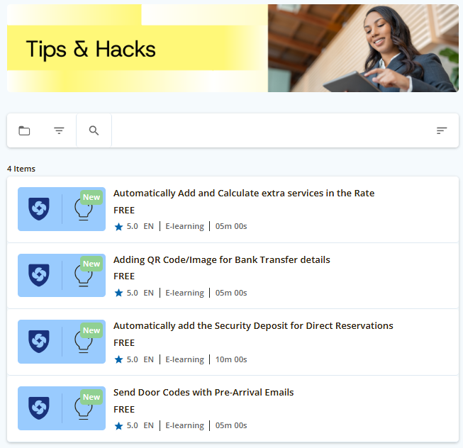 ส่วนนี้ได้รวบรวม เคล็ดลับที่ใช้งานง่ายและข้อมูลที่เป็นประโยชน์ เพื่อช่วยคุณในการดำเนินงานประจำวันของที่พักได้อย่างดีที่สุด คลิกที่หลักสูตรเคล็ดลับสั้นๆ ที่คุณชอบในรายการเพื่อเริ่มต้น: