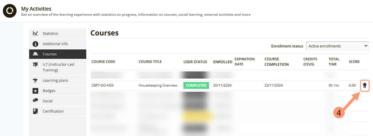 - ในส่วนหลักสูตรที่เสร็จสมบูรณ์ จะมี ไอคอนตราหรือใบรับรอง ขนาดเล็กปรากฏทางด้านขวา คลิกที่ไอคอนนี้ ใบรับรองจะถูกดาวน์โหลดโดยอัตโนมัติลงในอุปกรณ์ของคุณ