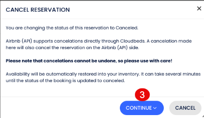 - คลิกเพื่อ ยกเลิกการจอง: การจองจะถูกยกเลิกใน Cloudbeds และคำขอยกเลิกจะถูกส่งไปยัง Airbnb