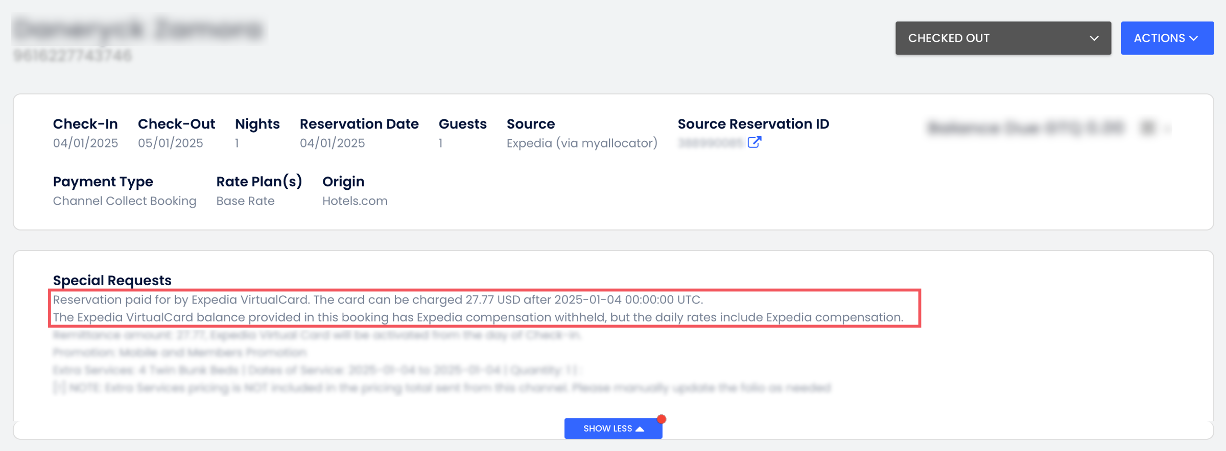 จำนวนยอดเงินบัตรเสมือน Expedia ที่แสดงบนเขตข้อมูล คำขอพิเศษ สำหรับบางที่พักคือ จำนวนสุทธิ ที่คุณจะได้รับจาก Expedia ซึ่งเป็นจำนวนรวมของการจองห้องพัก ลบค่าคอมมิชั่น (ประกอบด้วยค่าตอบแทนจาก Expedia, ภาษีที่เกี่ยวข้องกับค่าตอบแทน, และ ค่าตอบแทนจากภาษี)