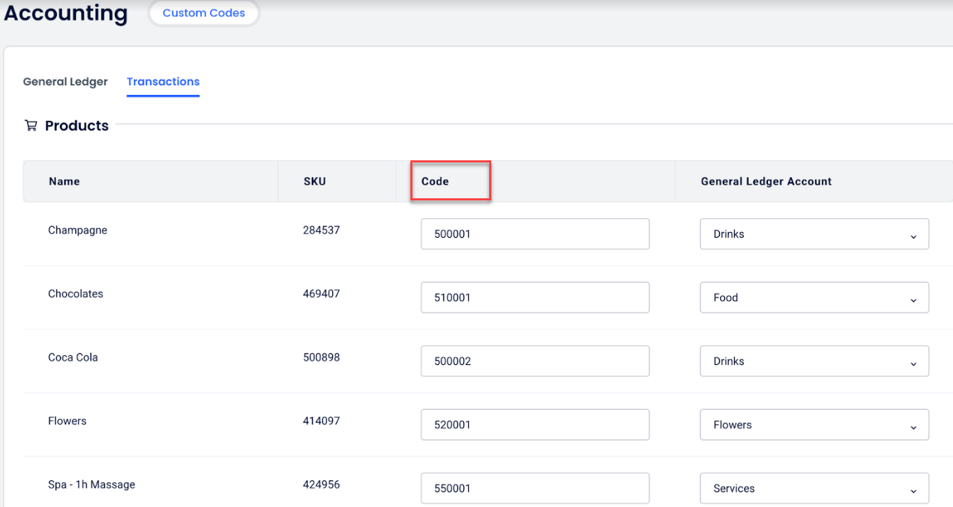 เพื่อเริ่มใช้รหัสธุรกรรมที่กำหนดเองเพียงแค่พิมพ์รหัสที่คุณต้องการในคอลัมน์ รหัส สำหรับแต่ละประเภทของธุรกรรม คุณสามารถใช้ตัวอักษร ตัวเลข และสัญลักษณ์ หลังจากที่คุณบันทึกการเปลี่ยนแปลงของคุณ ทุกธุรกรรมใหม่ที่เกิดขึ้นใน Cloudbeds จะมีรหัสธุรกรรมที่คุณมอบหมายให้ รหัสเหล่านี้จะปรากฏในรายงานทางการเงินของคุณและจะถูกรวมอยู่ในข้อมูลที่แชร์กับพันธมิตร Cloudbeds ผ่าน APIs