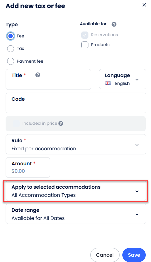 - โดยค่าเริ่มต้นจะถูกกำหนดเป็น ทุกประเภทที่พัก นี่หมายความว่าหากคุณไม่ทำการเปลี่ยนแปลงใด ๆ ภาษีและค่าธรรมเนียมที่มีอยู่จะยังคงใช้กับทุกประเภทที่พักเช่นเดียวกับที่มีอยู่ในปัจจุบัน