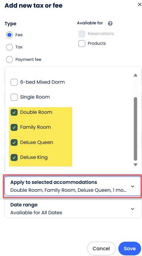 - คุณสามารถเลือกประเภทที่พักที่คุณต้องการให้ภาษีหรือค่าธรรมเนียมเฉพาะ นี้ช่วยให้คุณสร้างกฎภาษีและค่าธรรมเนียมที่เป้าหมายได้อย่างมีประสิทธิภาพ