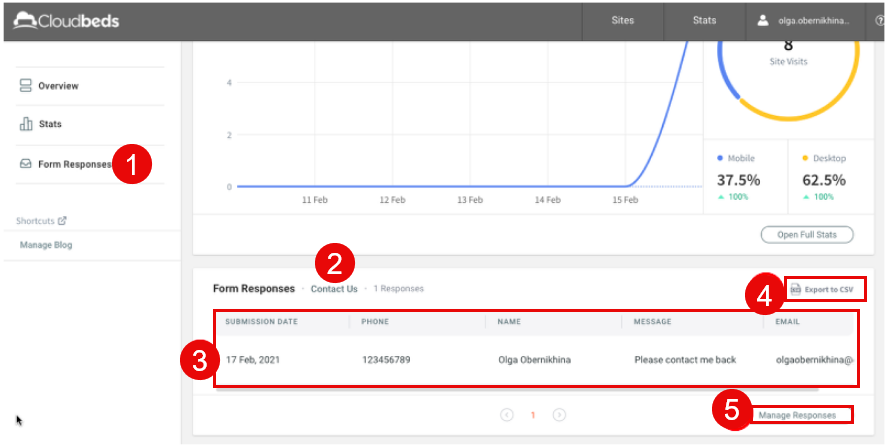 คุณสามารถใช้แบบฟอร์มติดต่อบนเว็บไซต์ของคุณที่แขกสามารถส่งข้อความเพื่อให้ติดต่อกลับ การส่งทั้งหมดจะถูกส่งไปยังอีเมลของที่พักของคุณ นอกจากนี้คุณยังสามารถส่งออกการตอบกลับและจัดการกับมันบนแพลตฟอร์มได้