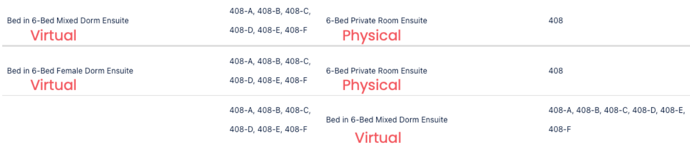 โดยการตั้งค่ารายการห้องพักของคุณในลักษณะนี้ การจองเตียงเดียวใน "เตียงในห้องนอนผสม 6 เตียงพร้อมห้องน้ำ" หรือ "เตียงในห้องนอนสำหรับหญิง 6 เตียงพร้อมห้องน้ำ" จะเข้าไปในหนึ่งในเตียงที่เป็นจริง (เช่น 408-A) เมื่อขายเตียงทั้งหกที่เป็นจริงแล้ว ห้องจะถูกทำเครื่องหมายว่าไม่ว่าง