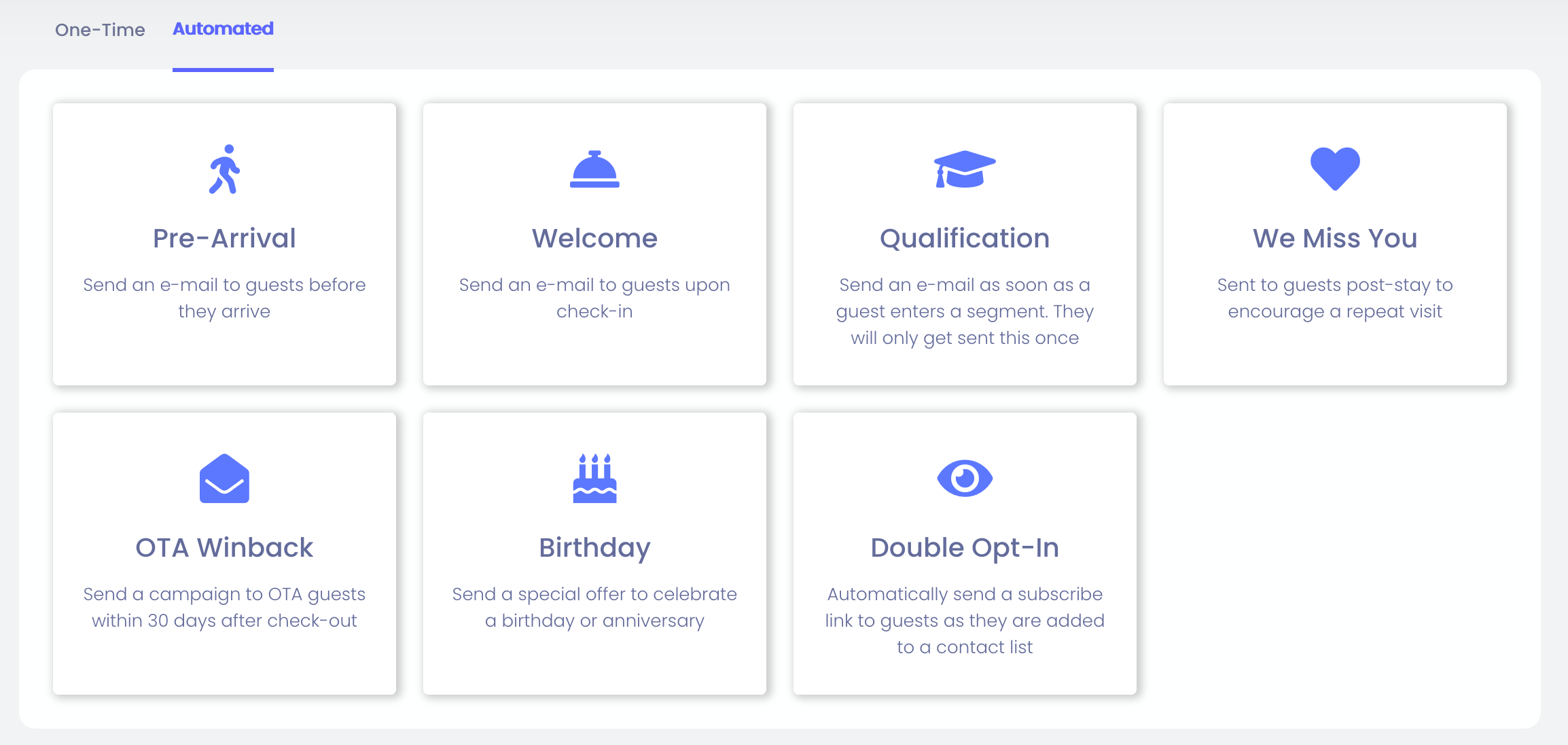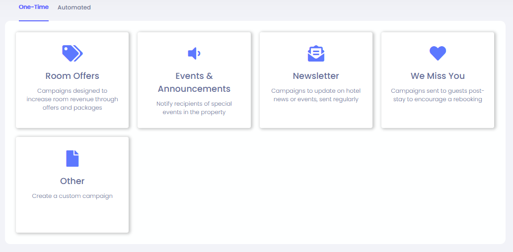 - OTA Winback - ส่งโดยอัตโนมัติถึงลูกค้าที่มีการจองผ่านช่องทาง OTA ต้องอยู่ภายใน 30 วันหลังเช็คเอาท์ มิฉะนั้นที่อยู่อีเมลของ OTA จะไม่ทำงานอีกต่อไป