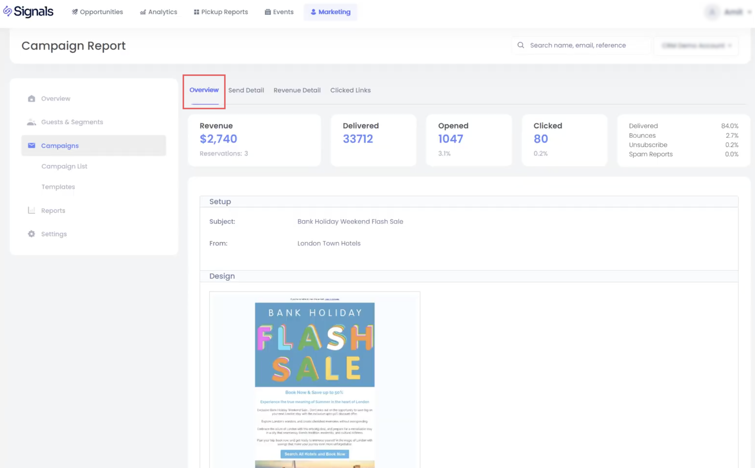 แท็บนี้ให้การแจกแจงของการจองทั้งหมดที่เชื่อมโยงกับแคมเปญ แสดงว่ามีรายได้เท่าไหร่ถูกสร้างขึ้น การจัดสรรรายได้ ขึ้นอยู่กับแบบจำลอง "last-touch" ที่เป็นมาตรฐานในอุตสาหกรรม: หากแขกเปิดหรือคลิกอีเมลแคมเปญแล้วทำการจองภายใน 30 วัน รายได้นั้นจะถูกกำหนดให้กับแคมเปญ สิ่งนี้ช่วยให้มีการวัดผลการตลาดอย่างยุติธรรมและสม่ำเสมอ