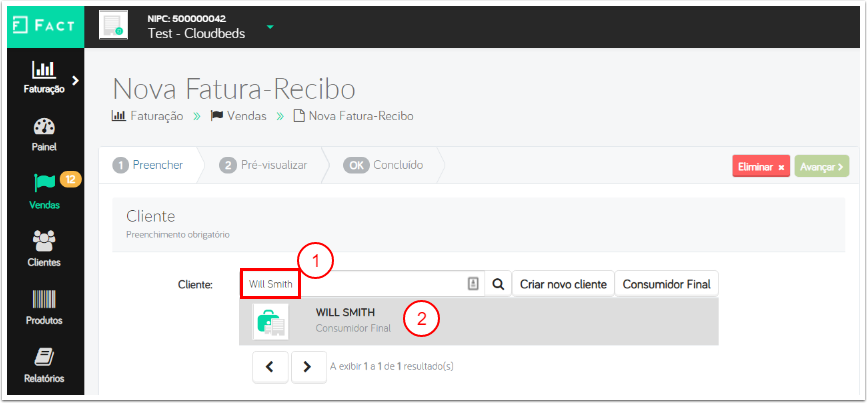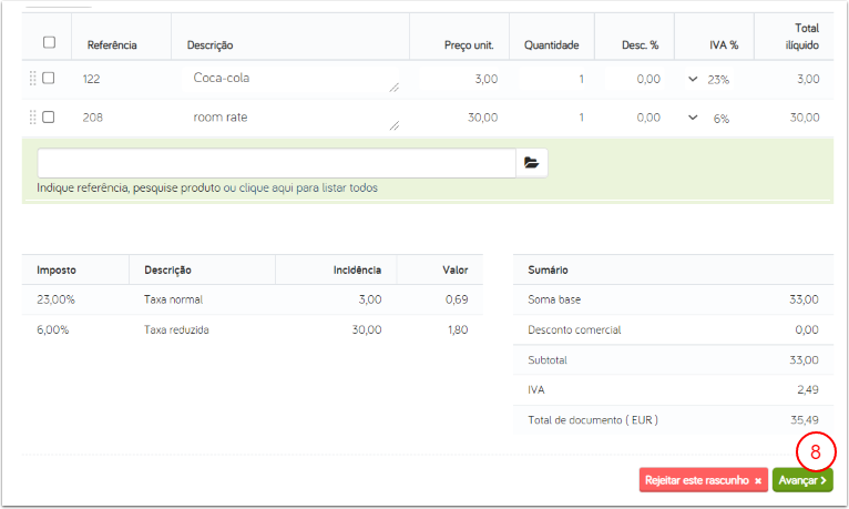 - ตรวจสอบให้แน่ใจว่าจำนวนผลิตภัณฑ์ทั้งหมดระหว่าง FACT และใบแจ้งรายการของแขกใน Cloudbeds PMS ตรงกัน หากทุกอย่างถูกต้อง คลิกที่ Avançar (ดำเนินการต่อ)