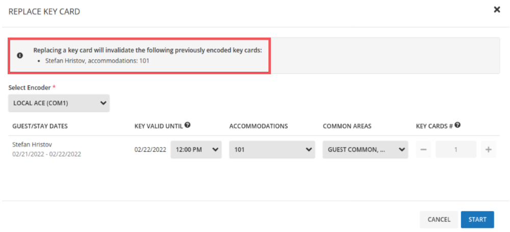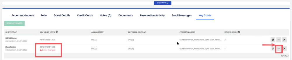 หากคุณขยายวันที่เข้าพักสำหรับแขก แท็บ คีย์การ์ด จะแสดงคำเตือนที่บอกว่าวันที่ของคีย์ยังไม่ได้รับการอัปเดต คลิกที่ปุ่ม แทนคีย์การ์ด เพื่อออกบัตรใหม่ที่แสดงวันที่การจองอัปเดตแล้ว
