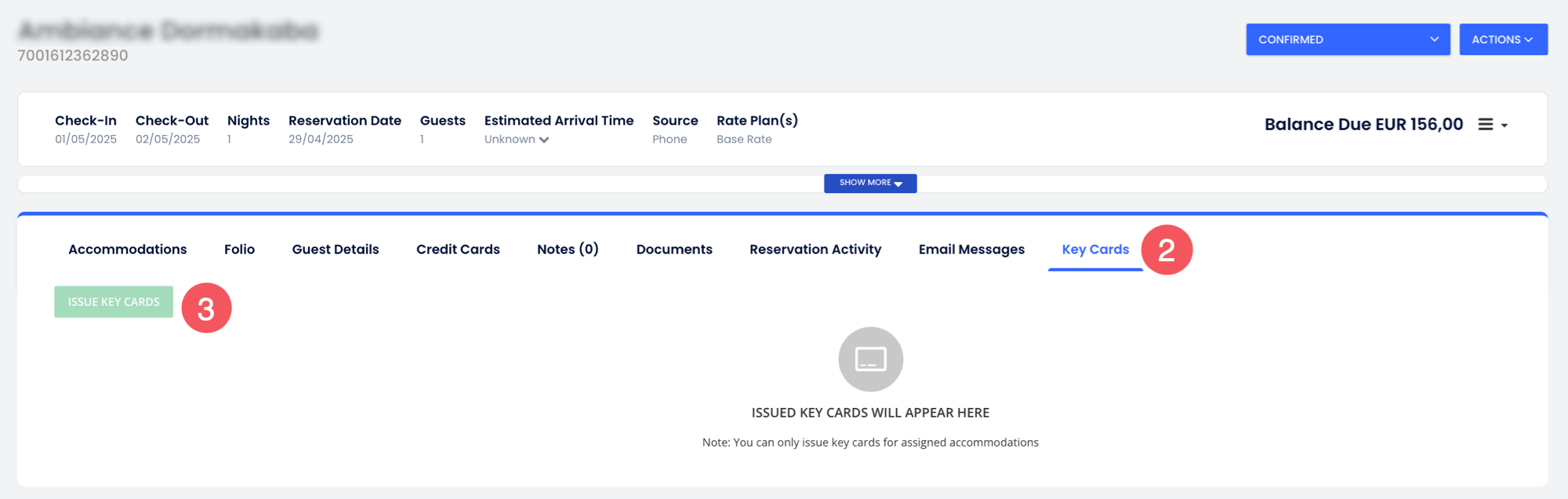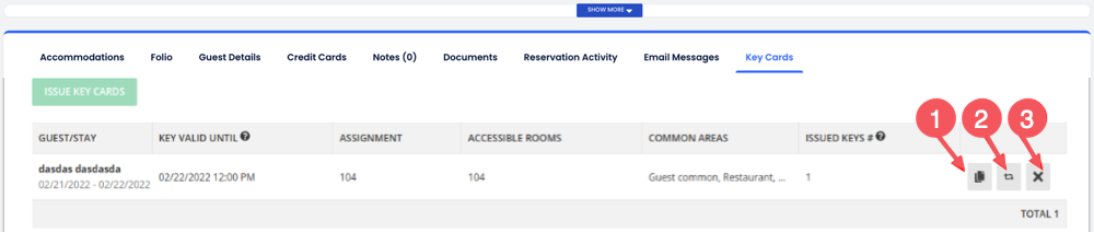 • เฉพาะการจองที่มีสถานะ ยืนยันแล้ว และ อยู่ในโรงแรม เท่านั้นที่สามารถออกคีย์การ์ดใหม่ได้ ปุ่ม ออกคีย์การ์ด จะไม่สามารถใช้งานสำหรับสถานะการจองอื่น ๆ