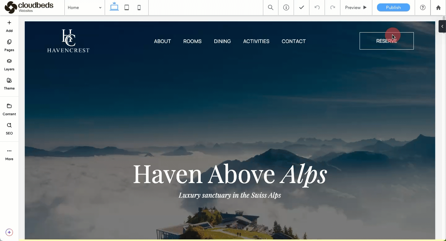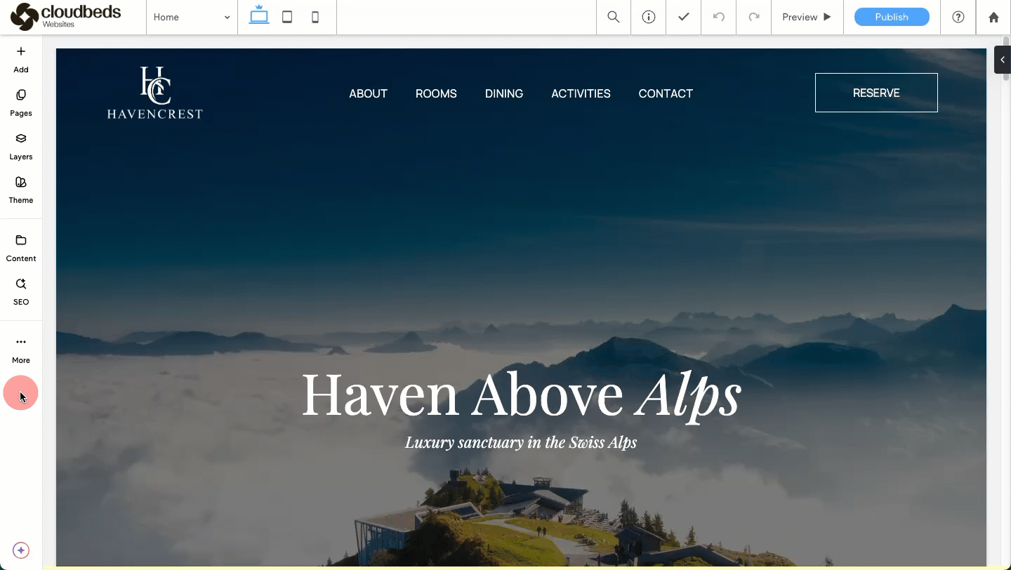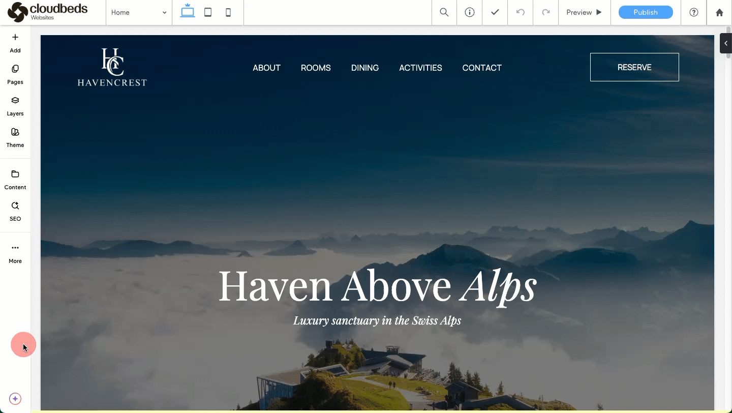 แตกต่างจากบริการออกแบบมืออาชีพ ตัวเลือกสร้างเว็บไซต์ด้วยตัวเองจะถูกจัดการโดยตรงผ่าน Cloudbeds พีเอ็มเอส ของคุณ: