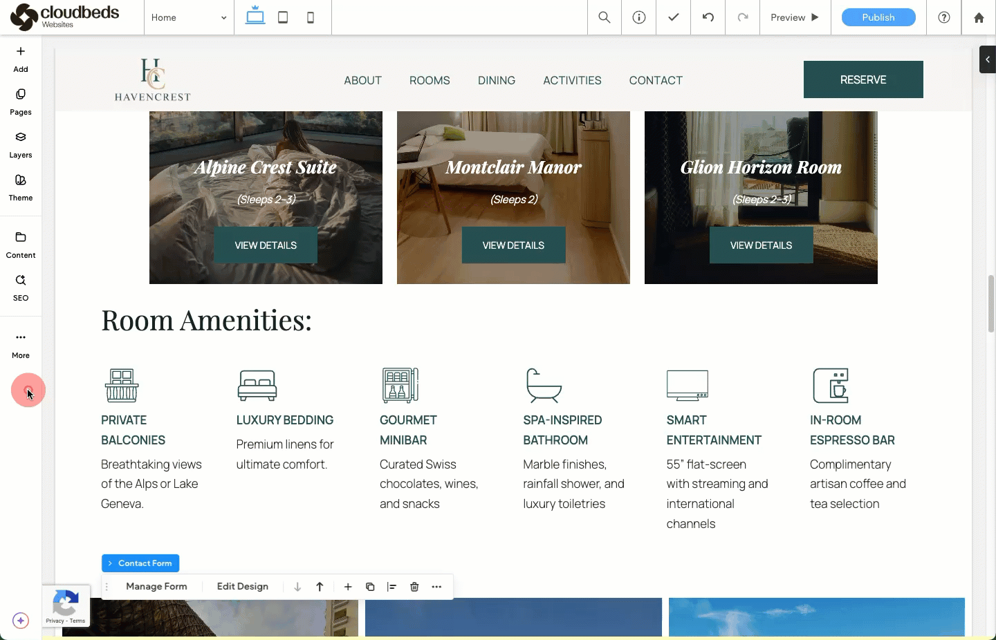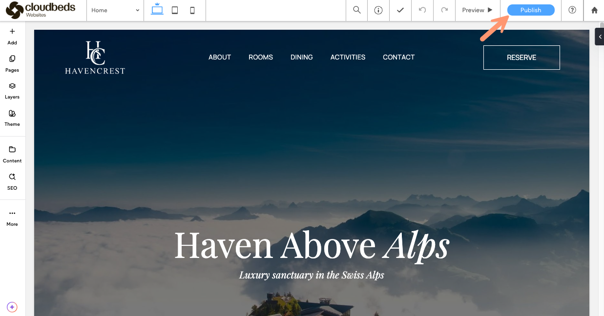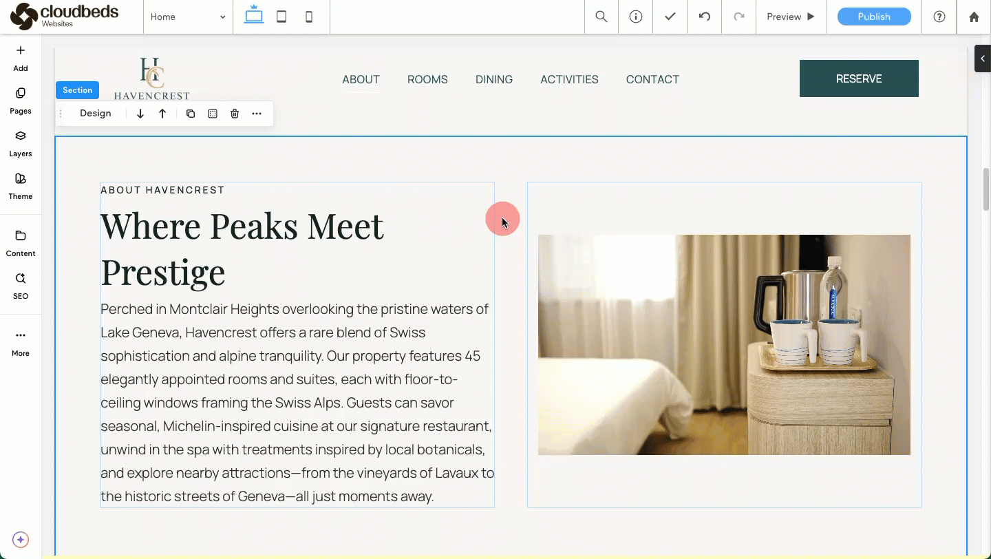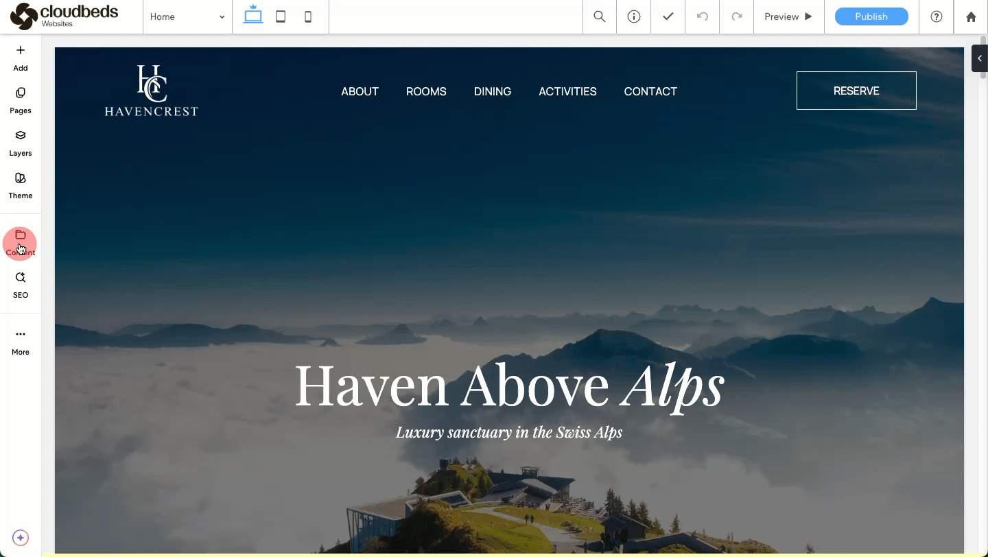 แตกต่างจากบริการออกแบบมืออาชีพ ตัวเลือกสร้างเว็บไซต์ด้วยตัวเองจะถูกจัดการโดยตรงผ่าน Cloudbeds พีเอ็มเอส ของคุณ: