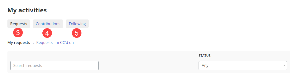 - Requests: This tab includes the list of all your requests, organized by date and status