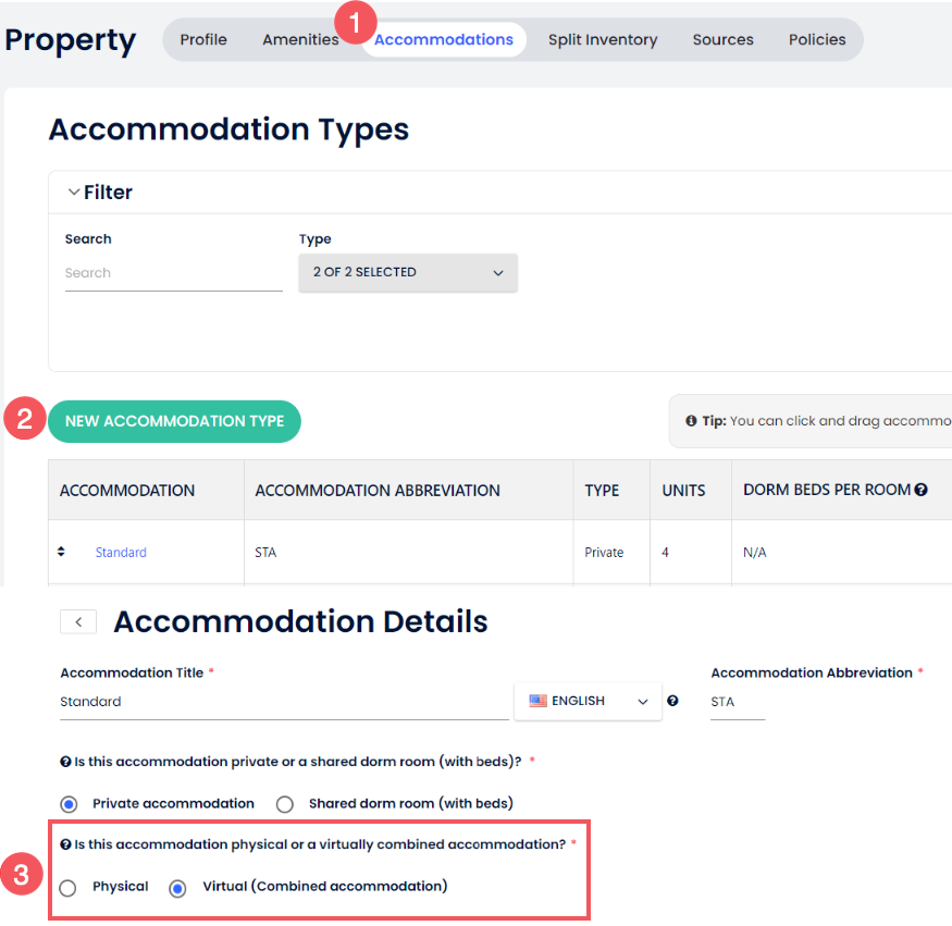 ❗Herhangi bir Envanter Bölme kurulumu için Sanal odanın Birincil Konaklama Türü olarak ayarlanması gerekir. Bu kurala uyulmaması doluluk tutarsızlıklarına yol açabilir.