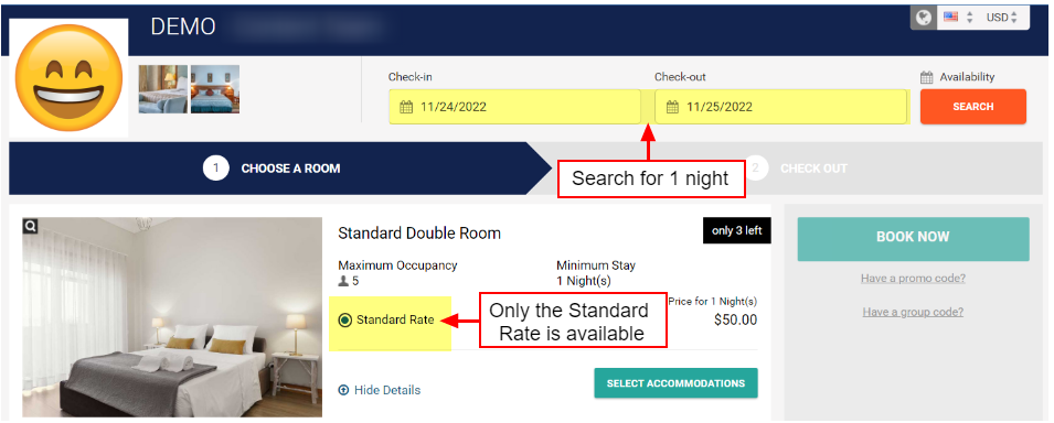 Örnek: 2 gecelik bir MinLOS, misafirin en az 2 gece rezervasyon yapması gerektiği anlamına gelir. Sadece 1 gece arandığında, fiyat planı arama sonuçlarında görünmez.