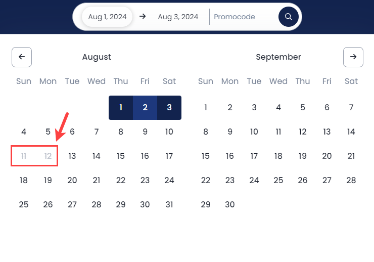 Kısıtlama uygulanmış tarih seçici (misafirler bu tarihte çıkış yapamaz)