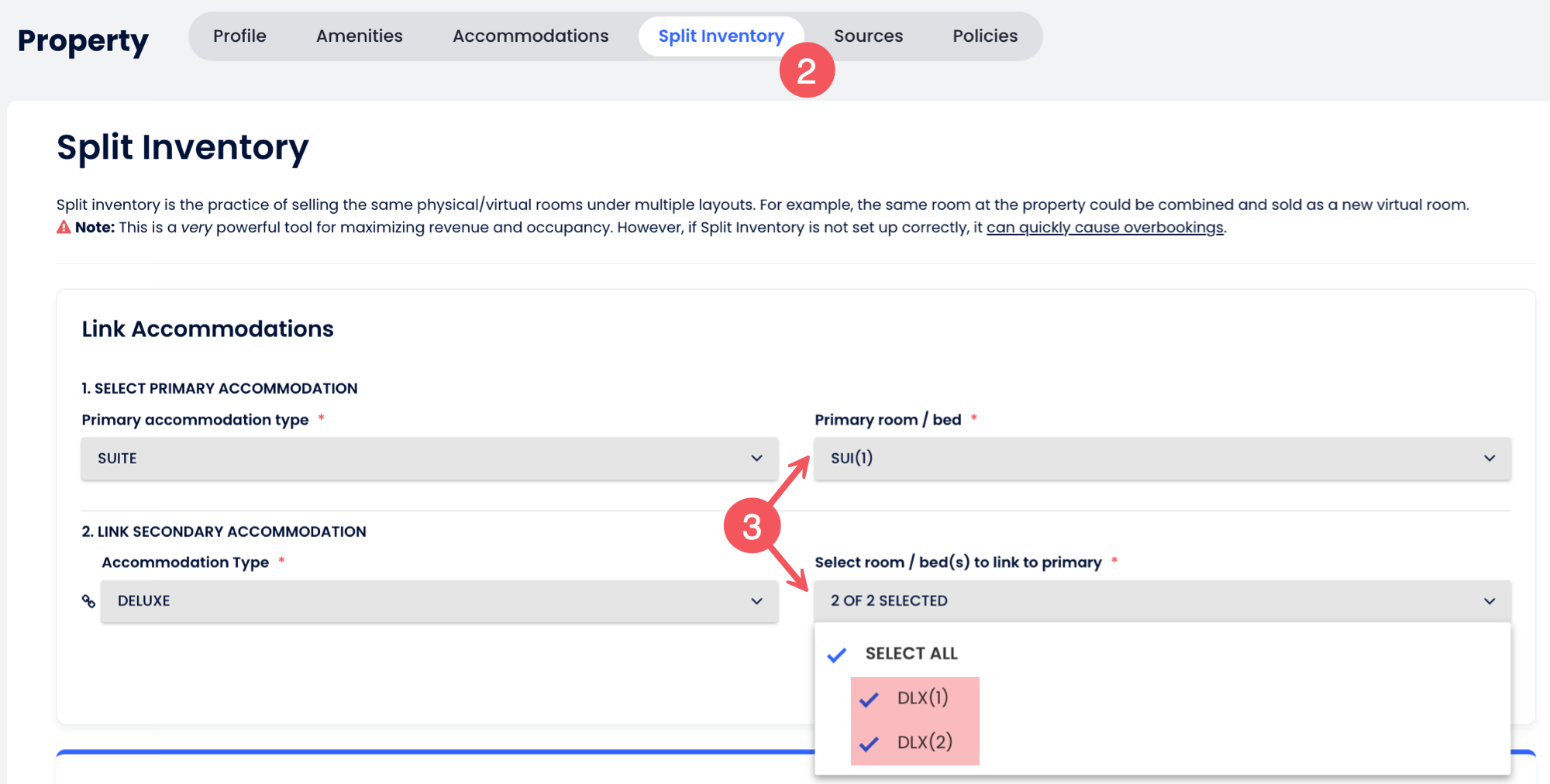 - Süit odayu birincil konaklama türü olarak seç, iki Deluxe odayu bir bağlantılı birim haline getirmek için bağla ve Kaydet butonuna tıkla. Bu, belirli doluluk seviyelerine göre bağlantılı odaların satışına erişimi engelleyecektir.