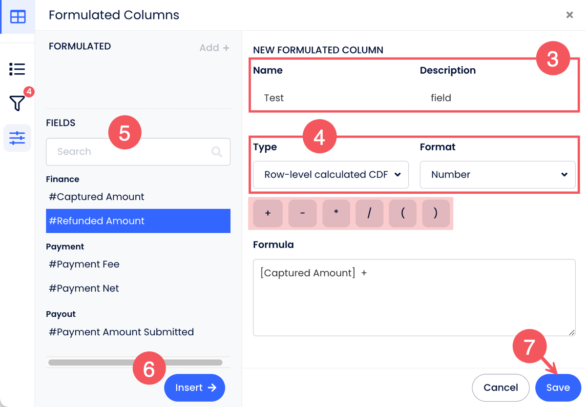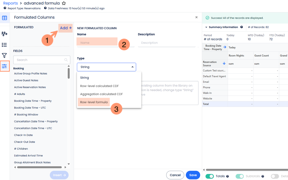 - Cloudbeds Raporlarını özelleştirirken veya bir Kaydedilmiş Raporu düzenlerken formüle edilmiş CDF'ler oluşturabilirsin.