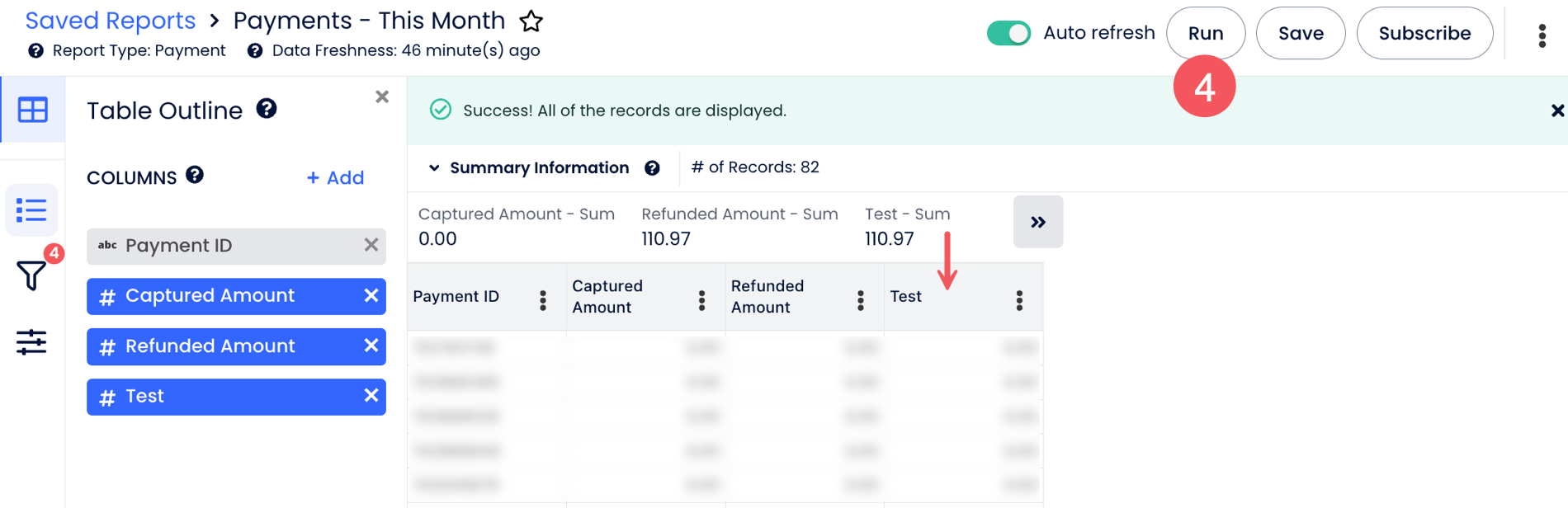 - Yeni sütunun göründüğünü ve değer döndürdüğünü doğrulamak için raporu çalıştır.