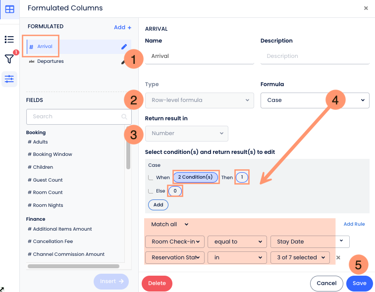 Formül, rezervasyon varış kurallarınla eşleştiğinde 1, aksi halde 0 döner. Sonuç sayısal olduğu için, raporda toplam varış sayısını hesaplamak üzere sütun toplanabilir.
