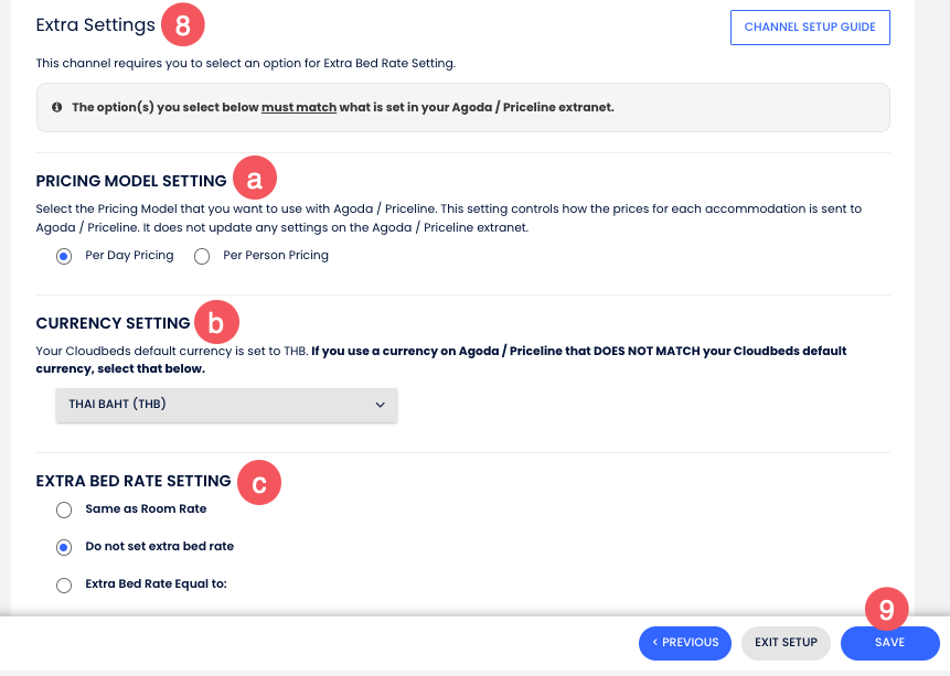 - Fiyatlandırma Modeli Ayarı - Agoda / Priceline ile kullanmak istediğin Fiyatlandırma Modelini seç. Bu ayar, her konaklama için fiyatların Agoda / Priceline’a nasıl gönderileceğini kontrol eder. Agoda / Priceline extranetinde herhangi bir ayarı güncellemez.
