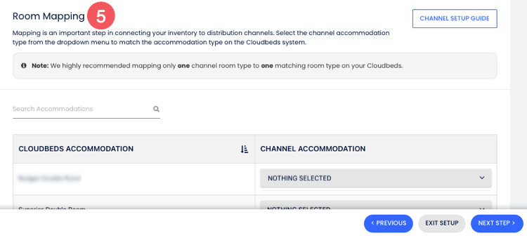 - Cloudbeds'te oluşturduğun oda tiplerini, Priceline/Agoda'daki karşılık gelen odalarla eşleştir. Kanalın extranetinde mevcut tüm odalar açılır menüde gösterilecektir. İşin bittiğinde Devam Et/Sonraki Adım butonuna tıkla.