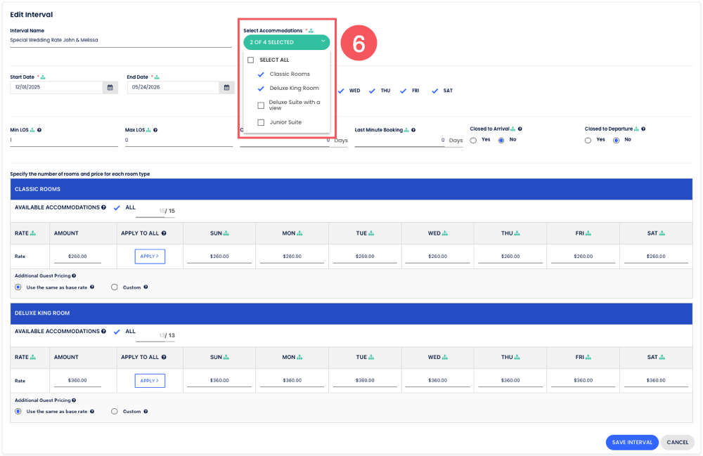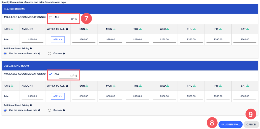 - Tümünü seçme seçeneğinin işaretini kaldır, oda sayısını ve her oda tipi için fiyatı belirt.