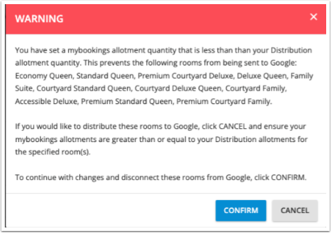 Onayla butonuna tıklarsan, Google’a hiçbir güncelleme gönderilmez ve kanal bağlantısı kesilir. Google Hotel Search’in düzgün çalışması için Rezervasyon Motoru Kontenjanını kanal dağıtımı kontenjanından daha yüksek ayarla.