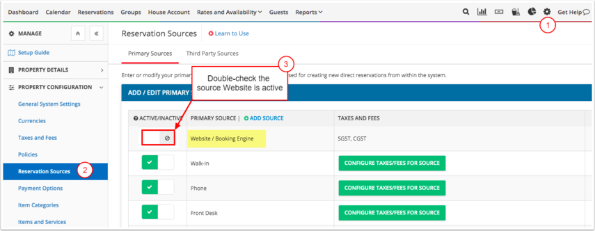 Rezervasyon Kaynakları ayarlarında Web Sitesi kaynağının etkin olup olmadığını kontrol et.