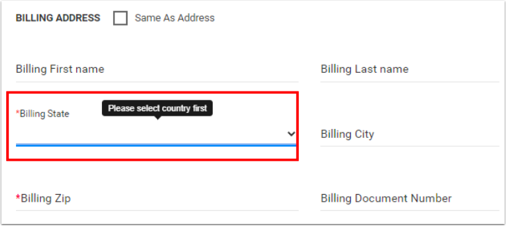 Fatura Eyaletine tıkladığında açılır menü boş ve şu mesaj çıkıyor: Lütfen önce ülkeyi seçin: