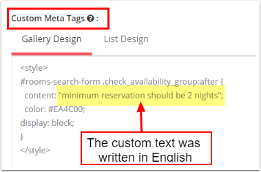 Rezervasyon motoru sayfasındaki Arama butonunun altına özel bir metin eklemek için Özel Meta Etiketler bölümüne kod ekledin.