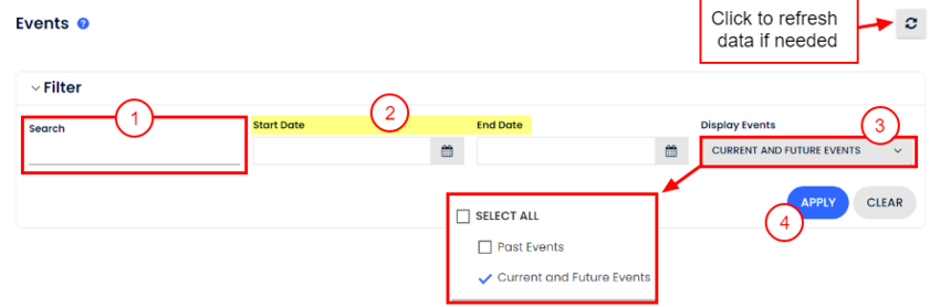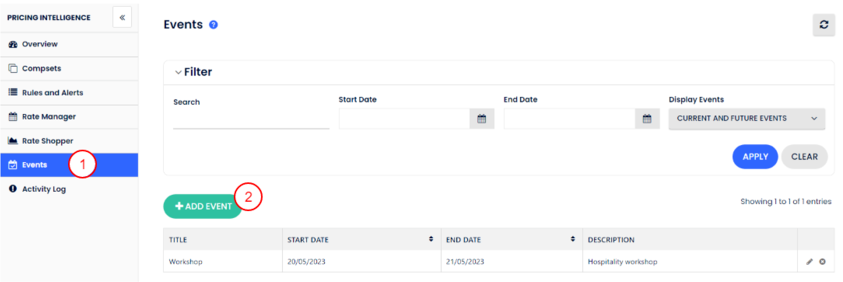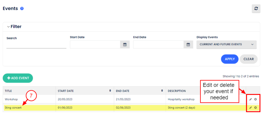 - Seçilen tarihlerle en az 1 gece çakışan etkinlikleri listelemek için tarih aralığına göre filtrele