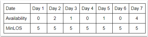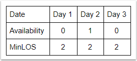 Aşağıdaki senaryoda, 2. Günde 1 oda müsait olduğunu, ancak 1. ve 3. Günlerde müsait oda olmadığını görebilirsin. Minimum Konaklama Süresi 2 olarak ayarlandığı için, Tesis bu odayı 2. Gün için asla satamaz.