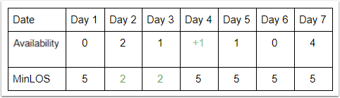 4. Gün için bir iptal olursa ve 4. Gün müsaitliği 1’e yükselirse, ve biz zaten 2. ve 3. Günler için Minimum Konaklama Süresini 2’ye değiştirmişsek ne olur?