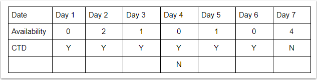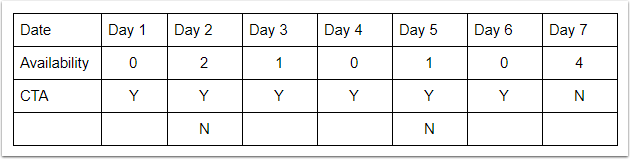 Aşağıdaki örnekte, 2., 5. ve 7. günlerden önceki günlerin müsaitliği olmadığını görüyoruz. 2. ve 5. günlerde CTA bayrağı ayarlanmış ve önceki gün müsaitlik olmadığı için, CTA bayrağı kaldırılmadıkça bu odaları satamayız. Bu yüzden CTA bayrağını kaldırmak için kuralı uygularız. 7. gün için CTA bayrağı ayarlı olmadığından günü satabiliriz, bu yüzden ona dokunmayız. Sadece CTA bayrağını kaldırırız, asla ayarlamayız.