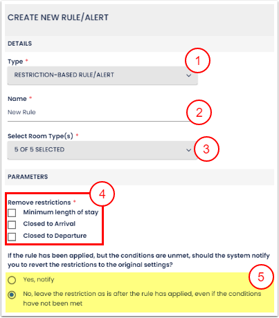 Kısıtlamaya dayalı kurallar, müsaitliğe bağlı olarak Minimum Konaklama Süresi (MinLOS), Girişe Kapalı (CTA) veya Çıkışa Kapalı (CTD) durumlarının kaldırılmasını tetikleyebilir; böylece bu kısıtlama nedeniyle satılamayan odaların satılmasını sağlar.