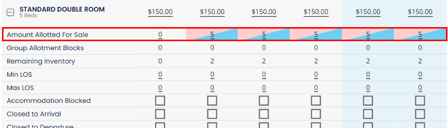 Gerçekte sahip olduğundan daha fazla oda eklediğinde, Satışa Ayrılan Miktar açık kırmızı ile işaretlenir, bu da potansiyel fazla rezervasyon günlerini gösterir. Eğer 2 renk varsa, bu tarihlerde değişiklik yapıldığı (mavi) ve potansiyel fazla rezervasyona izin verildiği (açık kırmızı) anlamına gelir: