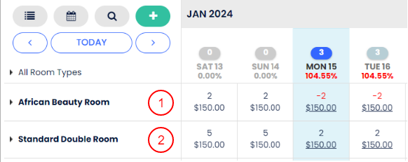 Belirli bir oda tipinde %100’den fazla doluluk (örneğin aşağıdaki African Beauty Room’da fazla rezervasyon) varsa ancak diğer odalarda, örneğin Standart Çift Kişilik Oda (2) gibi müsaitlik varsa, aşağıdakiler olur: