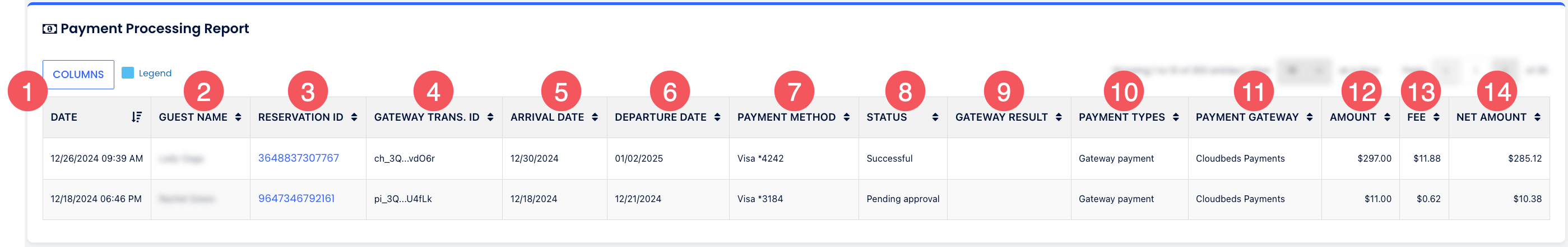 - Net Tutar: Toplam tutardan işlem ücreti çıkarıldıktan sonra kalan tutar (Cloudbeds Payments için geçerlidir).